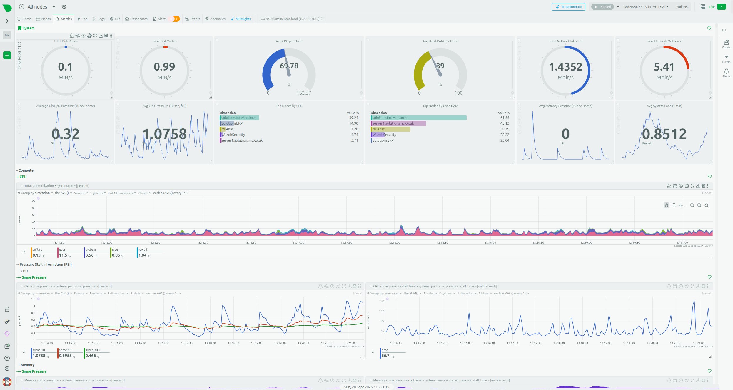 NetData provides rich, interactive dashboards immediately upon installation. Visualisation is integrated with the agent, eliminating the need to integrate and maintain external data presentation tools, such as Grafana. The dashboards provide a consolidated view of key system performance indicators, including detailed charts of CPU usage, memory pressure, and network traffic.