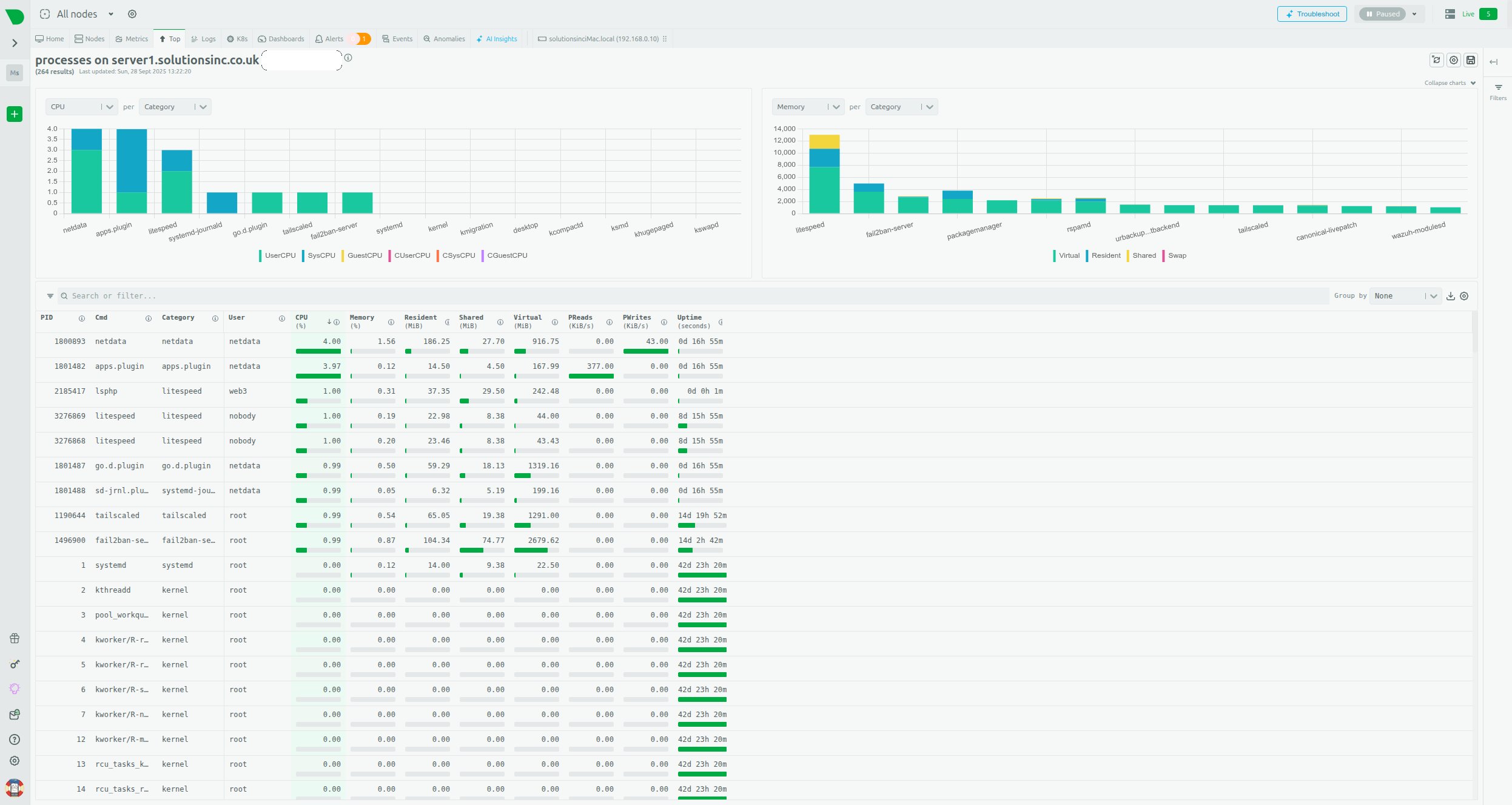 - Processes: This view presents a detailed table and charts of resource consumption (CPU, memory, I/O) at the individual process level, allowing for the immediate identification of resource-intensive applications (e.g., web server, database).