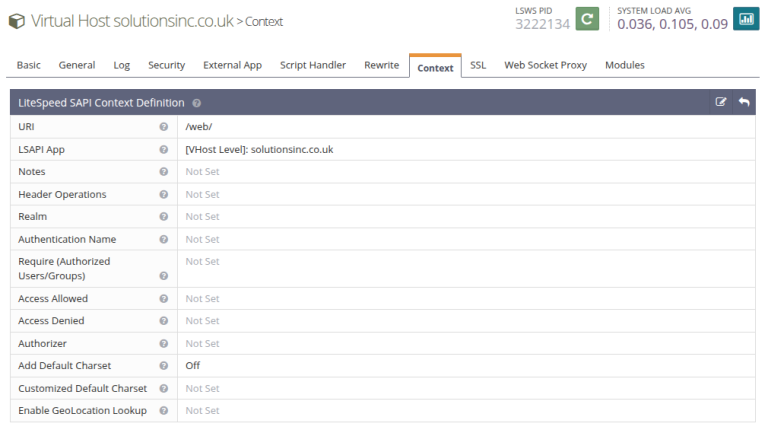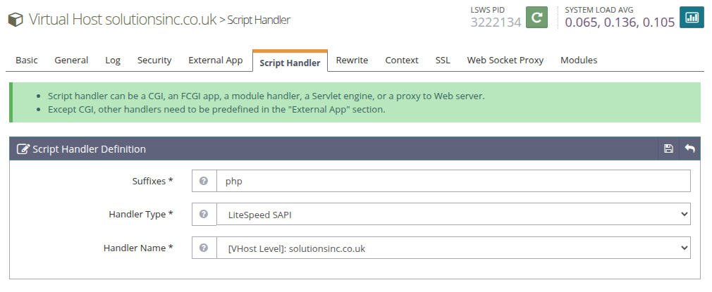 • In the “External App” panel, a LiteSpeed SAPI App named solutionsinc.co.uk has been defined. This is the central configuration point for handling the dynamic content of the site.